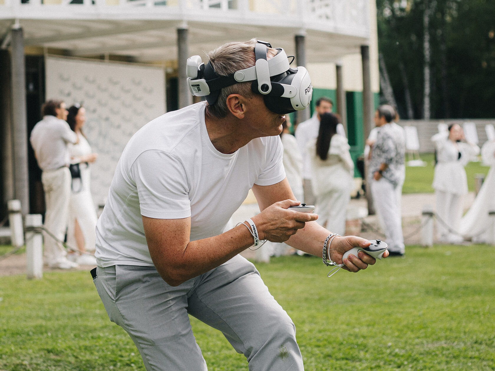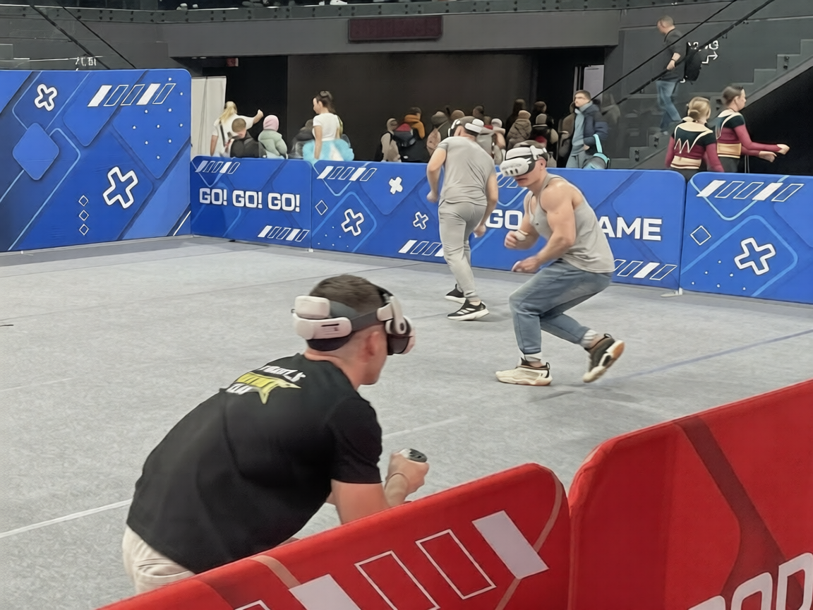 - Оборудование: беспроводные шлемы Oculus Quest 3, стойка для хранения, декоративный баннер, стильные ограждения зоны.